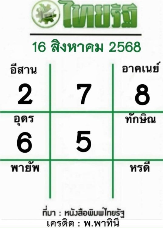 - เลขเด็ด ไทยรัฐ : 2, 6, 7, 5, 8