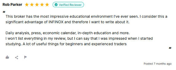 บทวิจารณ์ INFINOX จำนวนมากเน้นย้ำถึงคุณค่าเชิงปฏิบัติของความพยายามด้านการศึกษาของโบรกเกอร์ โดยเน้นย้ำถึงความมุ่งมั่นในการให้ข้อมูลและเตรียมความพร้อมแก่ผู้ซื้อขาย