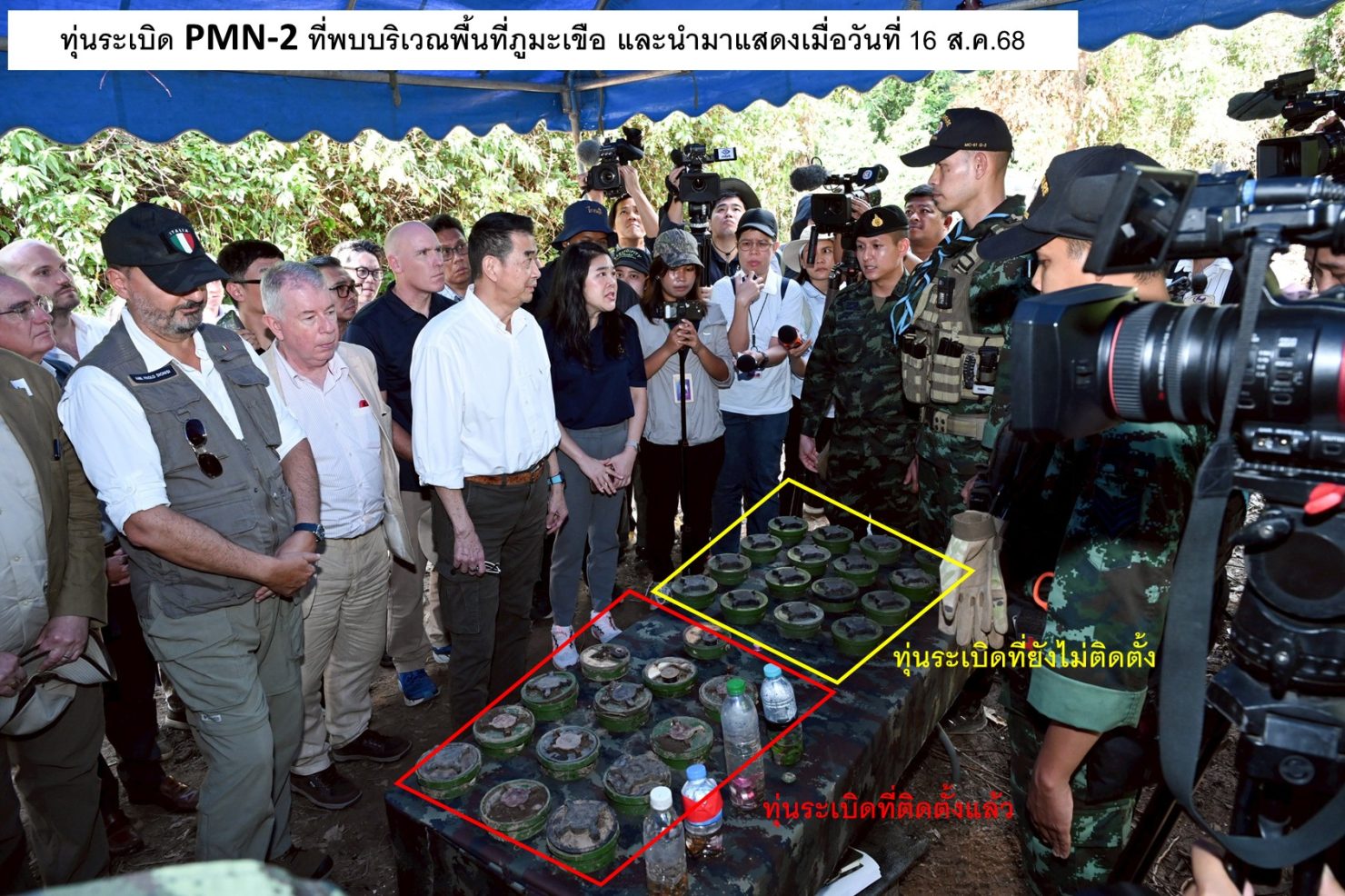 บริเวณดังกล่าวฝ่ายไทยได้ตรวจพบทุ่นระเบิดเป็นจำนวนมาก ส่วนใหญ่เป็นทุ่นระเบิดแบบ PMN-2 ซึ่งที่พบมีทั้ง 2 ลักษณะ คือ ทุ่นระเบิดที่เก็บไว้ยังไม่ได้นำไปติดตั้ง จึงเห็นในภาพว่ายังมีสลักนิรภัยติดอยู่ และ ทุ่นระเบิดที่ติดตั้งแล้ว ซึ่งในกรณีนี้จะไม่มีสลักนิรภัย โดยทั้งสองลักษณะได้ถูกนำมาแสดงให้คณะผู้แทนจากต่างประเทศได้ดูเมื่อวานนี้(16 ส.ค.68)