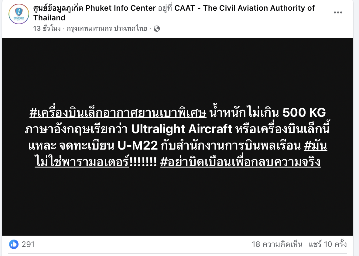 อย่างไรก็ดี ภายหลังในอำเภอถลางแถลงชี้แจง เพจศูย์ข้อมูลภูเก็ต โพสต์ข้อความโต้ว่า “เครื่องบินเล็กอากาศยานเบาพิเศษ น้ำหนักไม่เกิน 500 KG ภาษาอังกฤษเรียกว่า Ultralight Aircraft หรือเครื่องบินเล็กนี้แหละ จดทะเบียน U-M22 กับสำนักงานการบินพลเรือน #มันไม่ใช่พารามอเตอร์!!!!!!! #อย่าบิดเบือนเพื่อกลบความจริง”