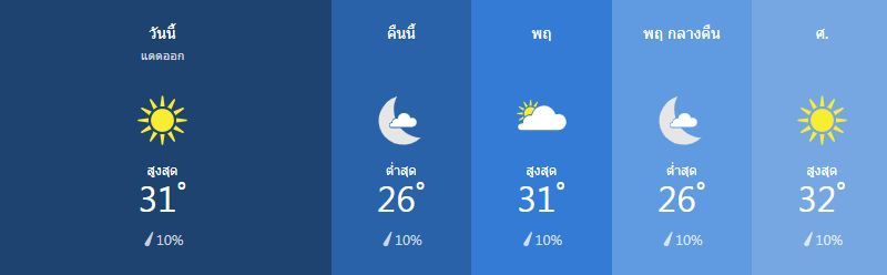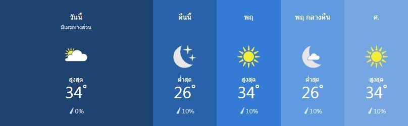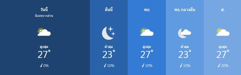 มีเมฆมากเป็นบางส่วน สูง 27เซลเซียส ความเร็วลม ตะวันออก ที่ 10 ถึง 15 กิโลเมตรต่อชั่วโมง