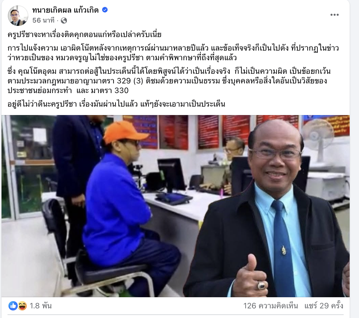 กระทั่งเป็นข่าวเมื่อคืนวานนี้ ล่าสุด ทนายเกิดผล แก้วเกิด ได้แสดงความคิดเห็นต่อคดีนี้ ผ่านเฟซบุ๊กส่วนตัวว่า