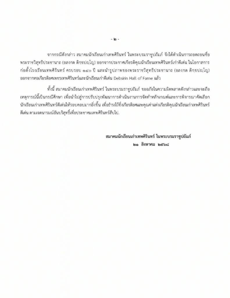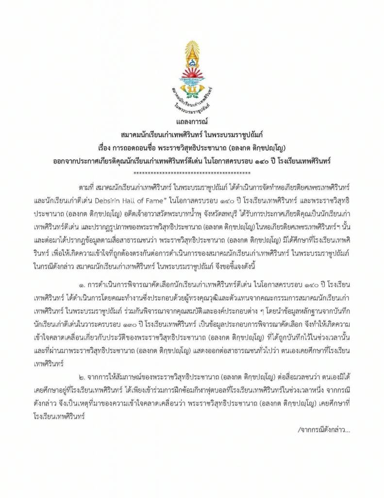 สมาคมนักเรียนเก่าเทพศิรินทร์ ในพระบรมราชูปถัมภ์ ออกแถลงการณ์ เรื่อง การนำรายชื่อพระราชวิสุทธิประชานาถ (อลงกต ติกฺขปญฺโญ) ออกจากประกาศเกียรติคุณนักเรียนเก่าเทพศิรินทร์ดีเด่น ในโอกาสครบรอบ 140 ปี โรงเรียนเทพศิรินทร์