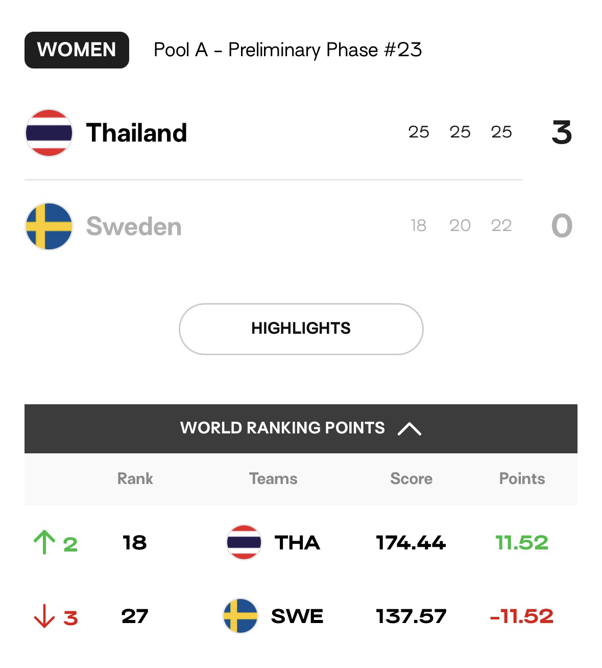 ผลการแข่งขันวอลเลย์บอลหญิงชิงแชมป์โลก 2025 เมื่อวันที่ 24 สิงหาคม ที่ผ่านมา ทีมชาติไทยเอาชนะทีมชาติสวีเดนไปได้อย่างสวยงาม 3-0 เซต (25-18, 25-20, 25-22) ไม่เพียงแต่จะทำให้ไทยการันตีการผ่านเข้าสู่รอบ 16 ทีมสุดท้ายเท่านั้น แต่ยังส่งผลสำคัญต่อคะแนนสะสมอันดับโลกอีกด้วยนั