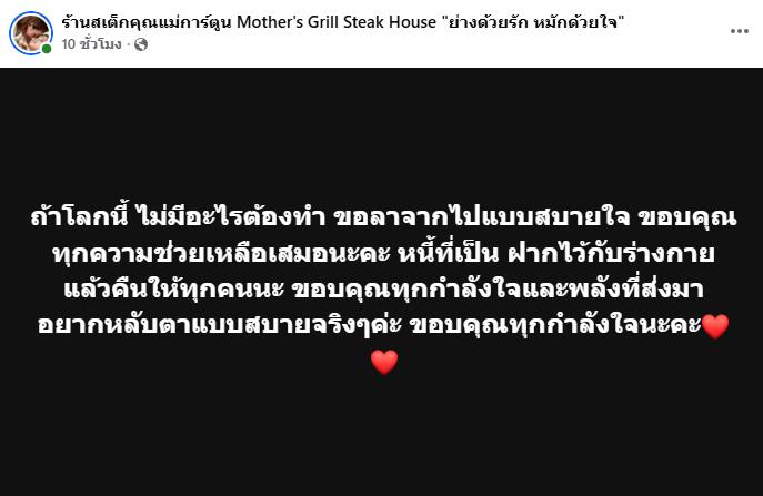 ล่าสุดเพจเฟซบุ๊ก Mother’s Grill Steak House “ย่างด้วยรัก หมักด้วยใจ” ซึ่งเป็นเพจเฟซบุ๊กร้านแม่น้องการ์ตูน หรือ น.ส.ศรัญญา ชำนิ ได้โพสต์ข้อความกลางดึกว่า “ถ้าโลกนี้ ไม่มีอะไรต้องทำ ขอลาจากไปแบบสบายใจ ขอบคุณทุกความช่วยเหลือเสมอนะคะ หนี้ที่เป็น ฝากไว้กับร่างกายแล้วคืนให้ทุกคนนะ ขอบคุณทุกกำลังใจและพลังที่ส่งมา อยากหลับตาแบบสบายจริงๆค่ะ ขอบคุณทุกกำลังใจนะคะ”