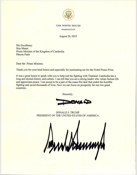 ฮุน มาเนต นายกรัฐมนตรีกัมพูชา ได้โพสต์ข้อความเฟซบุ๊ก ซึ่งเป็นจดหมายจากนายโดนัลด์ ทรัมป์ ประธานาธิบดีสหรัฐฯ หลังจากที่ก่อนหน้านี้กัมพูชายื่นเสนอผู้นำสหรัฐฯ เข้าชิงรางวัลโนเบลสาขาสันติภาพ จากที่มีส่วนยุติปัญหาความขัดแย้งไทย-กัมพูชา