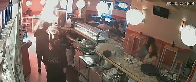 จากภาพวงจรปิดของร้าน Las Postas ในเมือง Los Palacios y Villafranca ประเทศสเปน แสดงให้เห็นชายคนหนึ่งกำลังเทน้ำมันเบนซินลงบนเคาน์เตอร์ ก่อนจะจุดไฟ ทำให้เปลวไฟลุกท่วมอย่างรวดเร็วท่ามกลางความตกใจของผู้คนที่อยู่ในร้าน