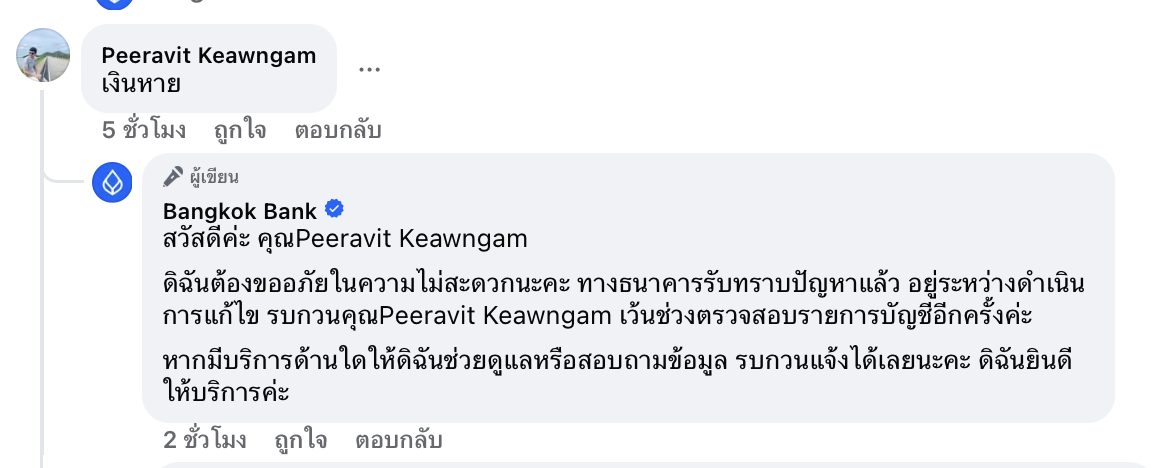 ล่าสุด แม้จะยังไม่มีการแจ้งประกาศปัญหาอย่างเป็นทางการออกมาจากธนาคารกรุงเทพ แต่ทางเพจได้เข้ามาตอบคอมเมนต์ว่า