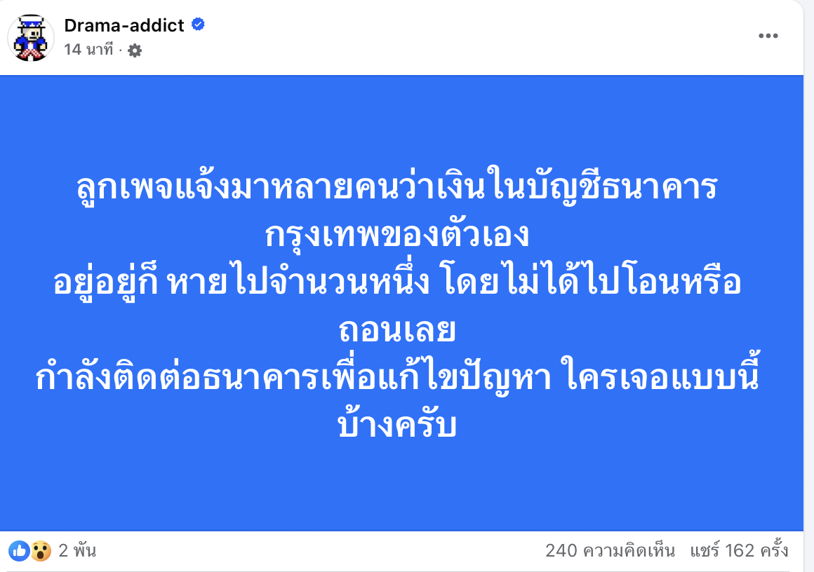 ด้านเพจดราม่า แอดดิก ก็ได้รับแจ้งจากลูกเพจว่า “เงินในบัญชีธนาคารกรุงเทพของตัวเอง อยู่อยู่ก็ หายไปจำนวนหนึ่ง โดยไม่ได้ไปโอนหรือถอนเลย กำลังติดต่อธนาคารเพื่อแก้ไขปัญหา ใครเจอแบบนี้บ้างครับ”