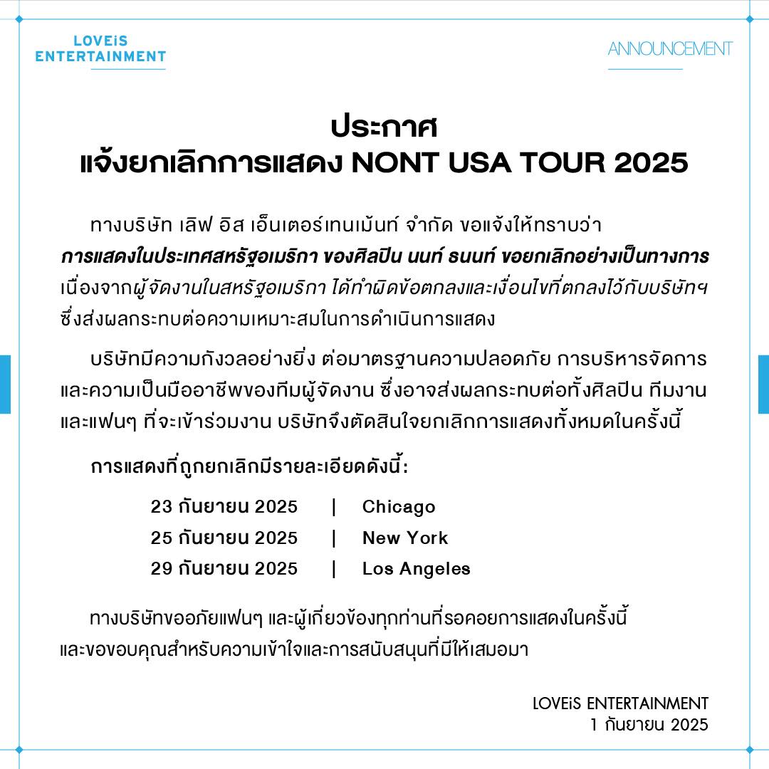 7. “นนท์ ธนนท์” ประกาศยกเลิกคอนเสิร์ตที่สหรัฐฯ ห่วงความปลอดภัย ค่ายเพลง LOVEiS Entertainment ต้นสังกัดของศิลปินชื่อดัง “นนท์ ธนนท์” ออกแถลงการณ์ประกาศยกเลิกการแสดงคอนเสิร์ตที่ประเทศสหรัฐอเมริกา เนื่องจากมีความกังวลเกี่ยวกับประเด็นด้านความปลอดภัยของศิลปินและทีมงาน