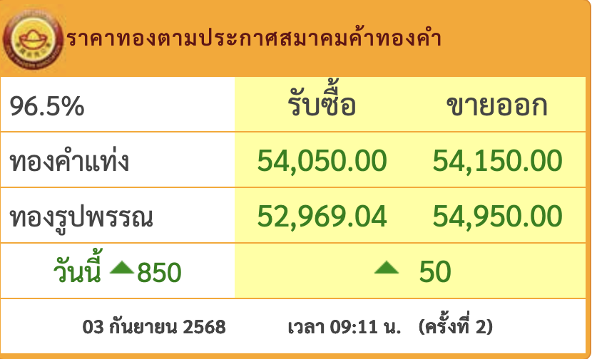 8. ราคาทองคำวันนี้พุ่ง 300 บาท ทองแท่งขายออก 54,100 บาท สมาคมค้าทองคำประกาศราคาทองคำในประเทศเช้าวันนี้ (3 ก.ย.) ปรับตัวสูงขึ้น 300 บาท เมื่อเทียบกับราคาปิดเมื่อวานนี้ ส่งผลให้ราคาทองคำแท่งขายออกอยู่ที่บาทละ 54,100 บาท และทองรูปพรรณขายออกที่ 54,900 บาท