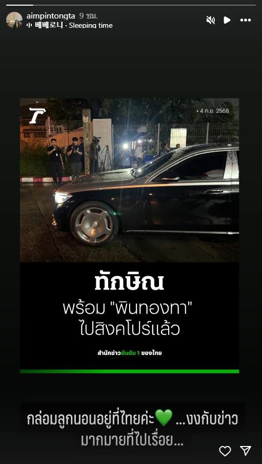 “พินทองทา-แพทองธาร” โพสต์สตอรี่ ยังอยู่ไทย ไม่ได้บินไปกับ “ทักษิณ”