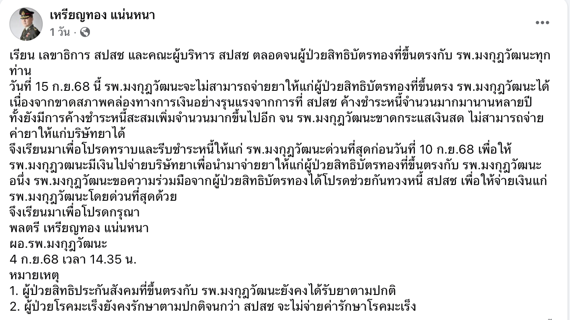 พลตรี เหรียญทอง แน่นหนา ผู้อำนวยการโรงพยาบาลมงกุฎวัฒนะ ประกาศผ่านเฟซบุ๊กส่วนตัวระบุว่า โรงพยาบาลจะงดจ่ายยาให้ผู้ป่วยสิทธิหลักประกันสุขภาพแห่งชาติ (บัตรทอง) ที่ขึ้นทะเบียนกับโรงพยาบาล ตั้งแต่วันที่ 15 กันยายน 2568 เป็นต้นไป