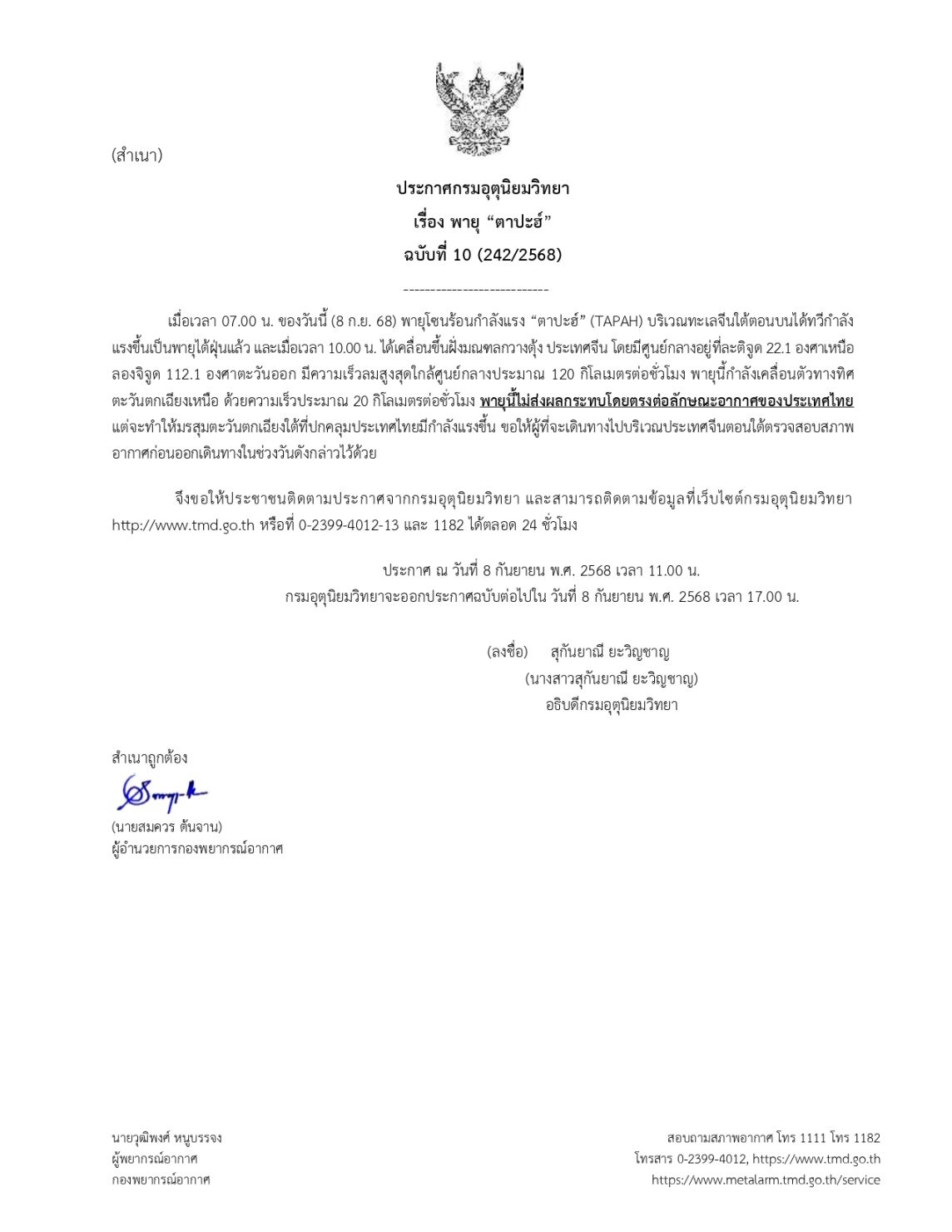 ประกาศกรมอุตุนิยมวิทยา เรื่อง พายุ “ตาปะฮ์” ฉบับที่ 10 (242/2568) ทวีรุนแรงเป็น “พายุไต้ฝุ่น” แล้ว ยืนยันไม่กระทบไทยโดยตรง แต่ทำให้มรสุมตะวันตกเฉียงใต้มีกำลังแรงขึ้น