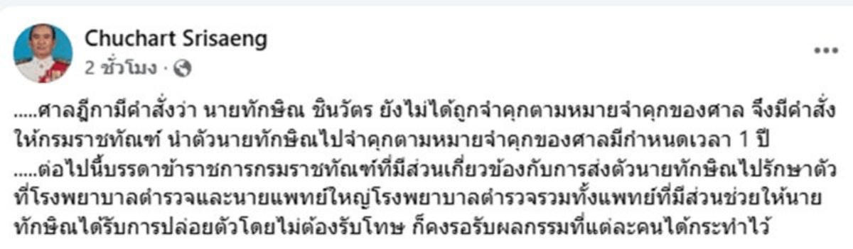 ด้าน นายชูชาติ ศรีแสง อดีตผู้พิพากษาหัวหน้าศาลฎีกา ไม่รอช้าเคลื่อนไหวผ่านบัญชีโซเชียล โดยเป็นการวิเคราะห์ถึงผลลัพธ์หนนี้จากคำตัดสอนศาลฎีกาที่มีต่อนายทักษิณ อาจจะส่งผล “หางเลข” ไปถึงบรรดาข้าราชการขงอกรมราชทัณฑ์ที่มีส่วนเกี่ยวข้องกับการส่งตัวอดีตผู้นำตัวกลั่นไปรักษาที่รพ.ตำรวจ