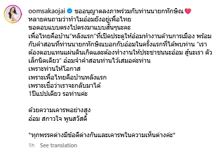 “ขออนุญาตลงภาพร่วมกับท่านนายกทักษิณ หลายคนถามว่าทำไมอ๋อมยังอยู่เพื่อไทย ขอตอบแบบตรงไปตรงมาแบบสั้น ๆ นะคะ