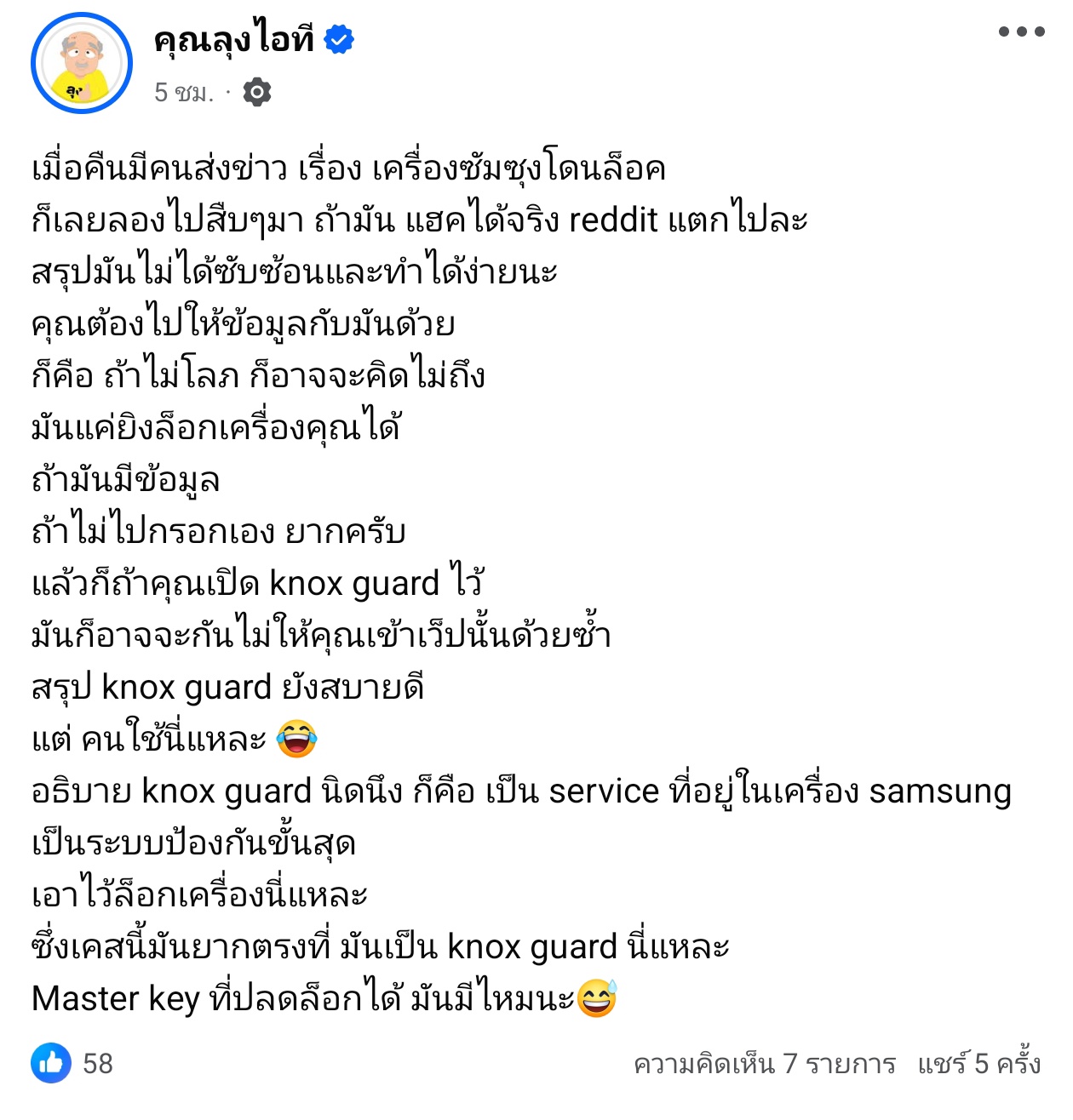 ล่าสุด เพจ “คุณลุงไอที” ผู้เชี่ยวชาญด้านเทคโนโลยี ได้ให้ข้อมูลเพิ่ม เติมเกี่ยวกับกลไกการโจมตีว่าไม่ได้เกิดขึ้นเพียงแค่กดลิงก์ แต่มีความ ซับซ้อนกว่านั้น โดยระบุว่าคนร้ายจะหลอกล่อให้เหยื่อเข้าไปที่เว็บไซต์ ปลอม แล้วให้กรอกข้อมูลสำคัญของเครื่องด้วยตนเอง เมื่อมิจฉาชีพได้ ข้อมูลไปแล้ว จะนำข้อมูลนั้นไปสั่งล็อกเครื่องจากระยะไกลผ่านระบบ Knox Guard