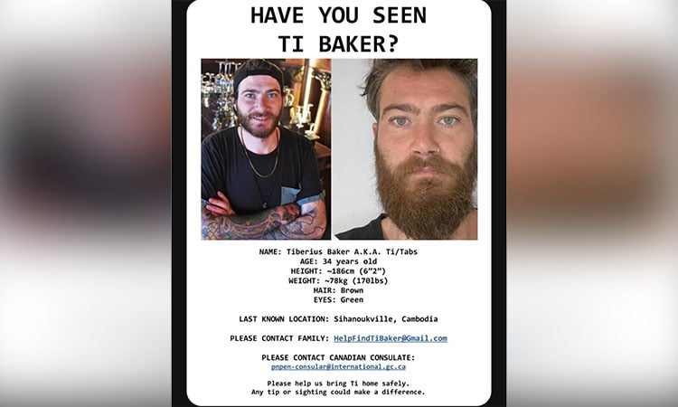 ครอบครัวและเพื่อนของ ไทบีเรียส “ไท” เบเกอร์ (Tiberius ‘Ti’ Baker) ชายชาวแคนาดาวัย 34 ปี ได้ประกาศขอความช่วยเหลือจากสาธารณชน เพื่อขอข้อมูลเกี่ยวกับเบาะแสของเขา หลังจากเขาหายตัวไปในกัมพูชาตั้งแต่ต้นปีที่ผ่านมา
