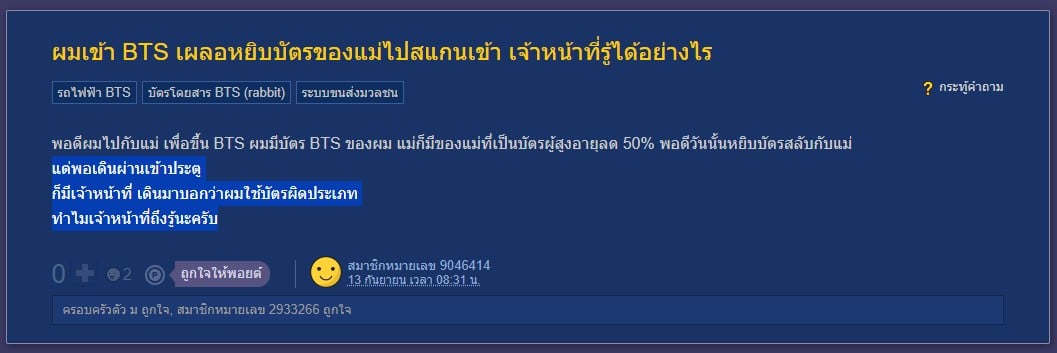 หนุ่มตั้งกระทู้ถาม เผลอหยิบบัตร BTS ผู้สูงอายุของแม่มาใช้ ก่อนเจอพนักงานเข้าชาร์จทันที อยากรู้ว่าพนักงานรู้ได้ยังไงว่าใช้บัตรผิดประเภท