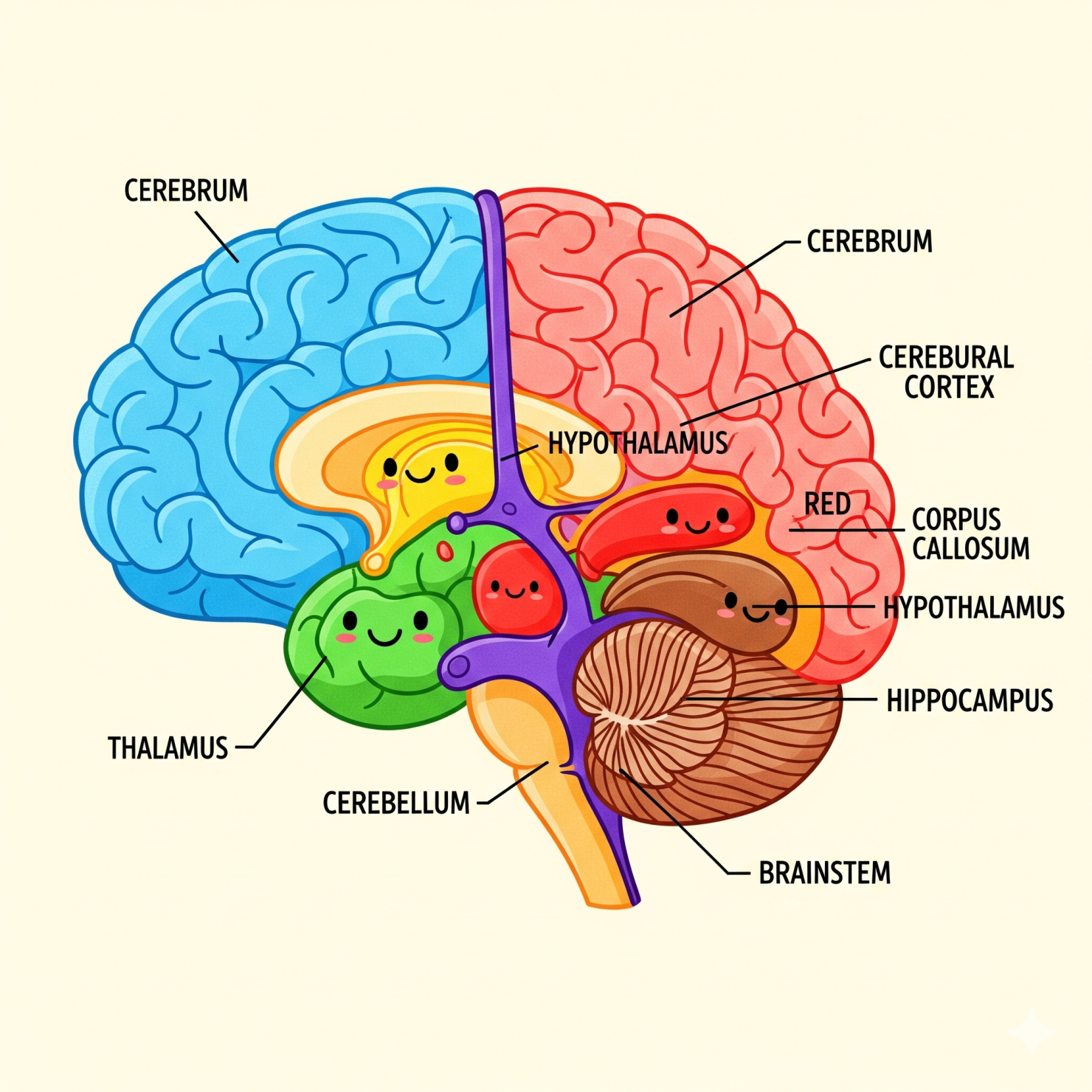- สมองน้อย (Cerebellum) เกี่ยวข้องกับการควบคุมการเคลื่อนไหวและกระบวนการรับรู้อื่นๆ