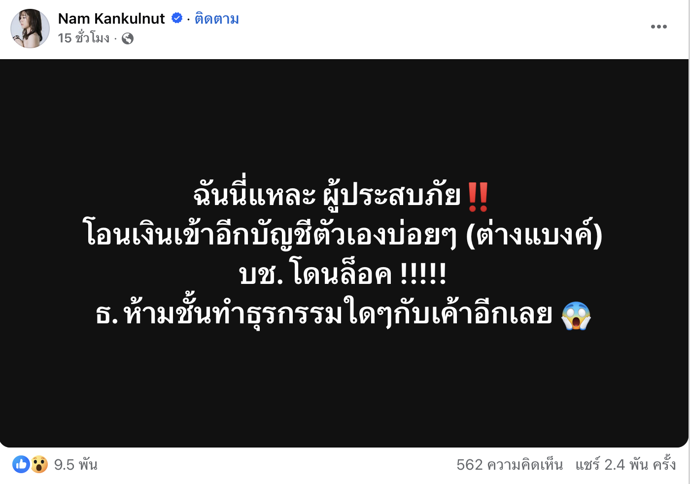 จากกรณีในโลกออนไลน์ แห่แชร์กรณี โอนเงินเข้าออกระหว่างบัญชีตัวเองโดนอายัด รวมถึงนักร้องสาว น้ำ AF 11 กัญญ์กุลณัช ปัญญากิตตินันท์ ก็ได้ออกมาแชร์ประสบการณ์ประสบภัย ผ่านเฟซบุ๊ก Nam Kankulnut ว่าตนเองก็โดนอายัดบัญชีจากการโอนเงินระหว่างบัญชีตัวเองเช่นเดียวกัน ไปที่ธนาคาร ยื่นเรื่อง ยื่นเอกสาร ก็ไม่ได้ ไม่ให้ใช้อย่างเดียวเลย