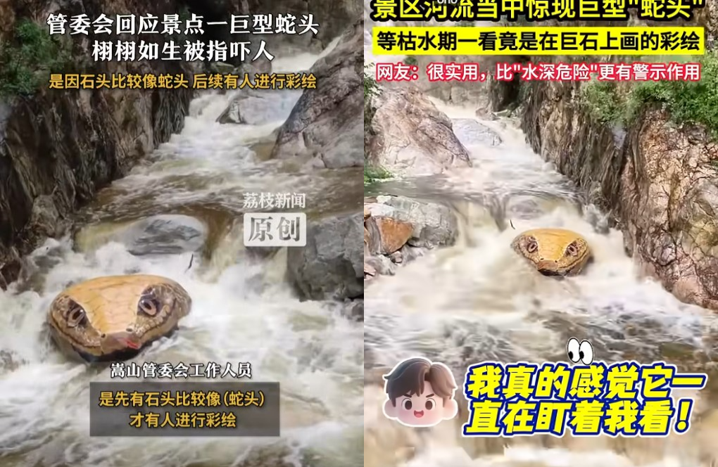 กลายเป็นที่ฮือฮาในโลกออนไลน์ เมื่อหินขนาดใหญ่ที่มีรูปทรงพิเศษในแม่น้ำของแหล่งท่องเที่ยวเหยยวี่หวงโกว (Yuhuanggou Scenic Area) ในเทือกเขาซงซาน (Songshan) มณฑลเหอหนาน ถูกนำไปเพนต์สีจนกลายเป็น “หัวงูเหลือมยักษ์สีทอง” ที่ดูสมจริงมากจนทำให้บางส่วนของนักท่องเที่ยวรู้สึกหวาดกลัว