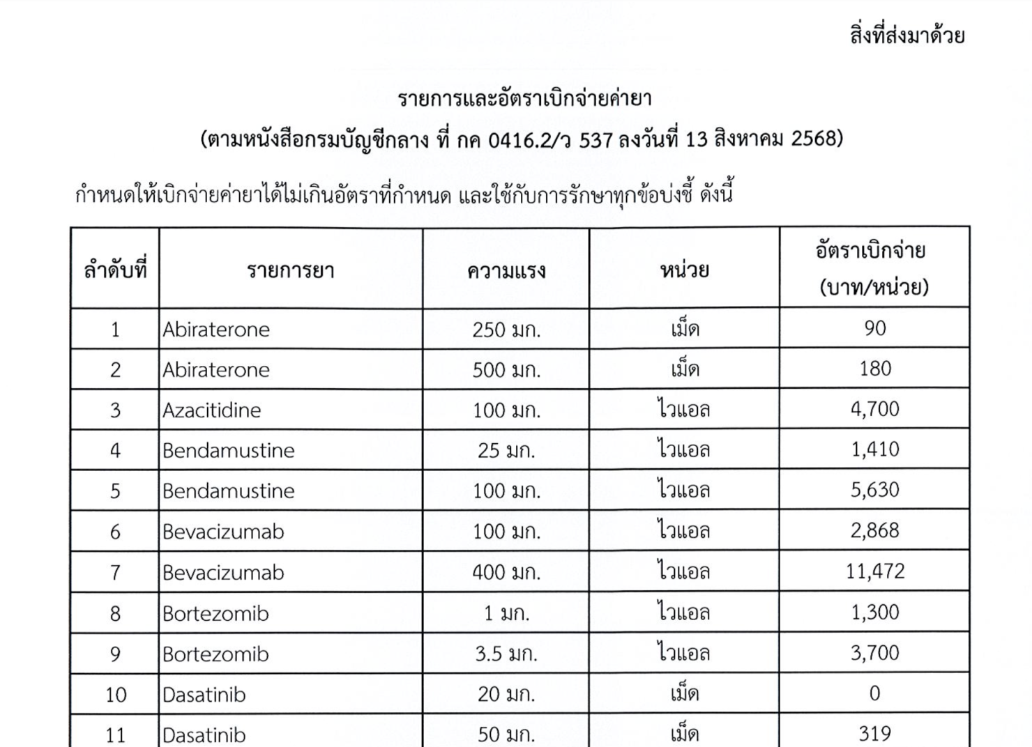 รายการ อัตราเบิกจ่ายค่ายา (ตามหนังสือกรมบัญชีกลาง ที่ กค ๐๔๑๖.๒/ว ๕๓๗ ลงวันที่ ๑๓ สิงหาคม ๒๕๖๘)