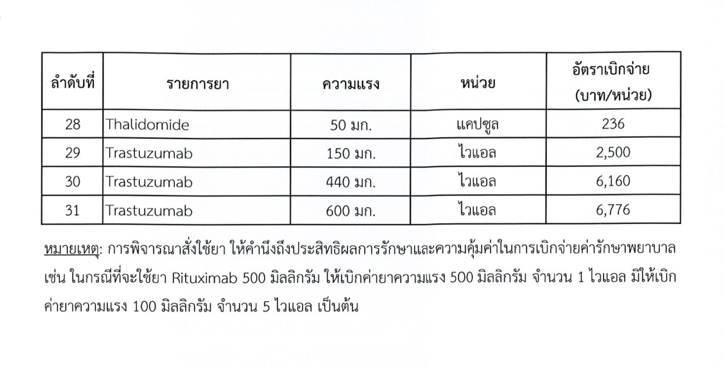 รายการยาที่ปรับปรุง ครอบคลุมยาที่จำเป็นหลายรายการ เช่น Abiraterone, Azacitidine, Bevacizumab, Rituximab และ Trastuzumab เป็นต้น การกำหนดอัตราเบิกจ่ายใหม่นี้จะทำให้การเบิกจ่ายค่ายาเป็นไปอย่างสมเหตุผลและคุ้มค่า