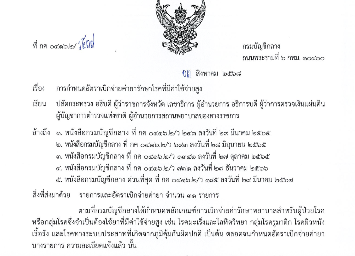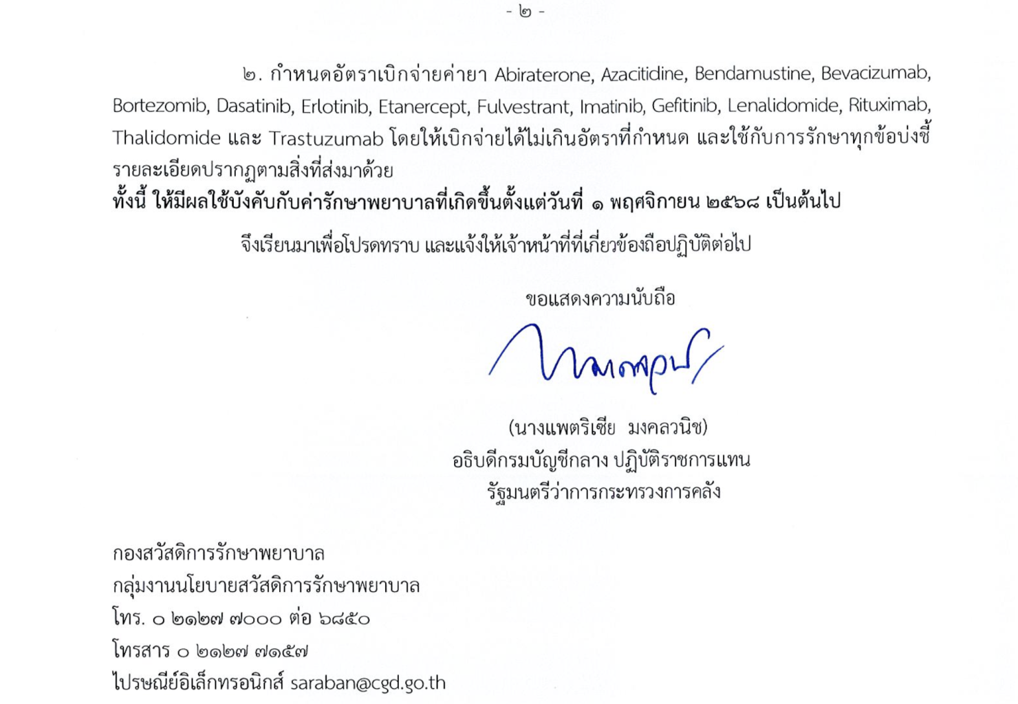 กรมบัญชีกลางได้ออกประกาศกำหนดอัตราเบิกจ่ายค่ายารักษาโรคมะเร็งและโลหิตวิทยาที่มีค่าใช้จ่ายสูง จำนวน 31 รายการใหม่ เช่น โรคข้ออักเสบรูมาตอยด์ โรคสะเก็ดเงิน โรคไตอักเสบลูปุส และโรคทางระบบประสาทที่เกิดจากภูมิคุ้มกันผิดปกติ เป็นต้น เพื่อให้ผู้มีสิทธิสวัสดิการรักษาพยาบาลข้าราชการสามารถเข้าถึงยาที่มีประสิทธิภาพมากขึ้น จะมีผลบังคับใช้สำหรับค่ารักษาพยาบาลที่เกิดขึ้นตั้งแต่วันที่ 1 พฤศจิกายน 2568 เป็นต้นไป