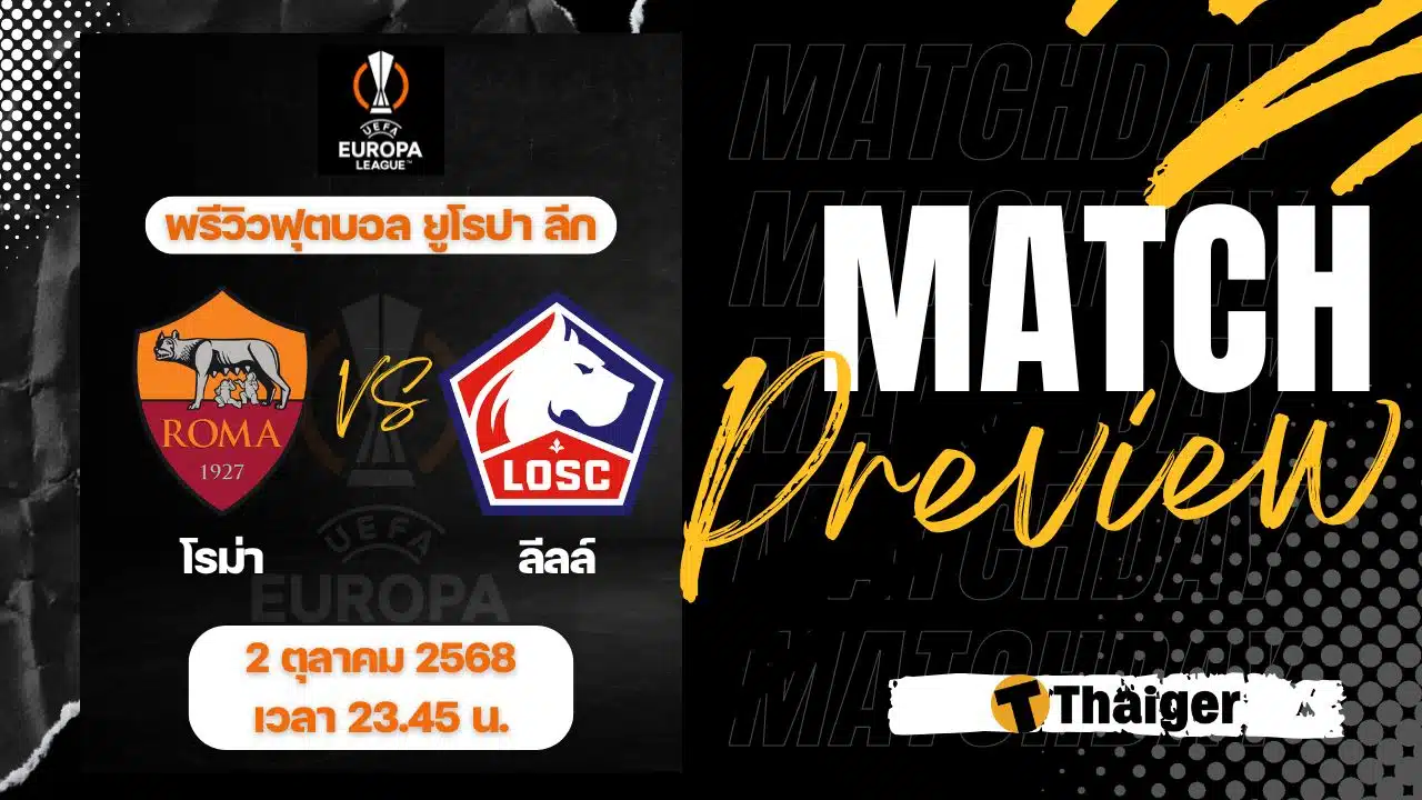 2 ตุลาคม 68 ดูบอลสด ฟุตบอล ยูโรป้า ลีก 2025/26 รอบลีกเฟส นัดที่ 2 ระหว่าง โรม่า พบ ลีลล์ ที่สนาม สตาดิโอ โอลิมปิโก เวลา 23:45 น. ตามเวลาประเทศไทย พร้อมถ่ายทอดสด