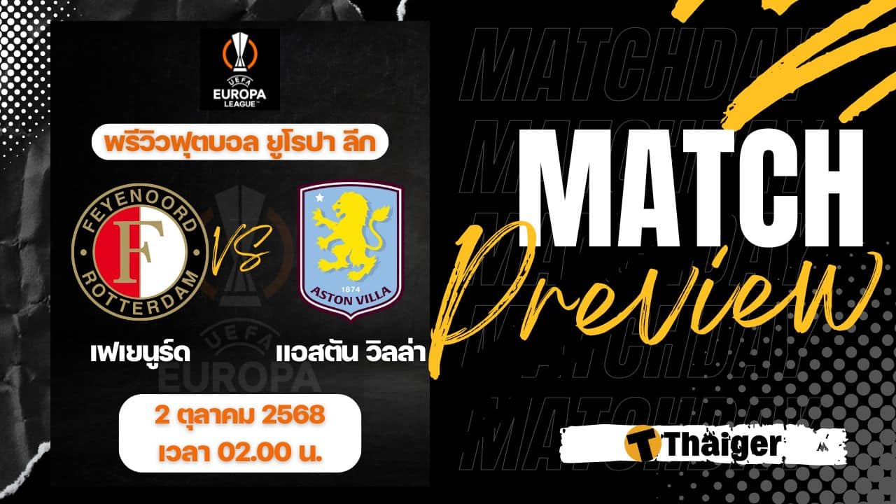 2 ตุลาคม 68 ดูบอลสด ฟุตบอล ยูโรป้า ลีก 2025/26 รอบลีกเฟส นัดที่ 2 ระหว่าง เฟเยนูร์ด พบ แอสตัน วิลล่า ที่สนาม เด คูอิป เวลา 02:00 น. ตามเวลาประเทศไทย พร้อมถ่ายทอดสด