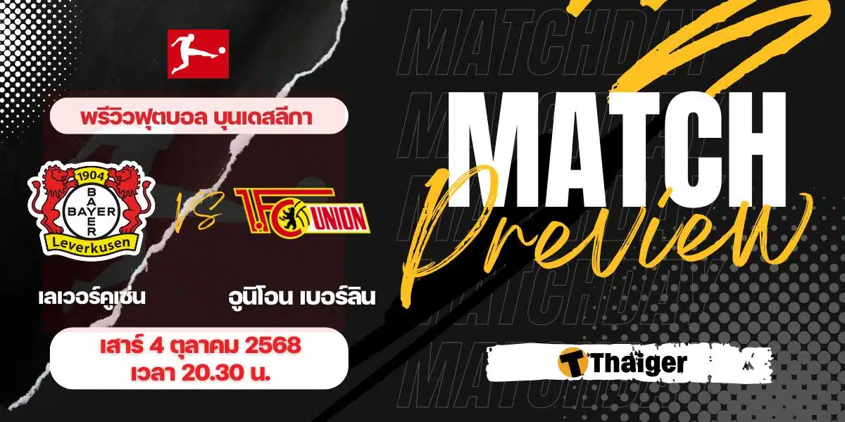 4 ตุลาคม 2568 เวลา 20.30 น. ถ่ายทอดสด ดูบอลสด ฟุตบอล บุนเดสลีกา ฤดูกาล 2025/26 ที่สนาม ไบอารีนา ระหว่าง เลเวอร์คูเซ่น พบ อูนิโอน เบอร์ลิน The Thaiger พาไปวิเคราะห์เกม พร้อมการทำนายผล และคาดการณ์ 11 ตัวจริงได้ที่นี่
