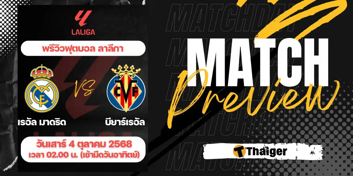 4 ตุลาคม 2568 เวลา 02.00 น. ถ่ายทอดสด ดูบอลสด ฟุตบอล ลาลีกา ฤดูกาล 2025/26 ที่สนาม ซานติอาโก เบร์นาเบว ระหว่าง เรอัล มาดริด พบ บียาร์เรอัล The Thaiger พาไปวิเคราะห์เกม พร้อมการทำนายผล และคาดการณ์ 11 ตัวจริงได้ที่นี่