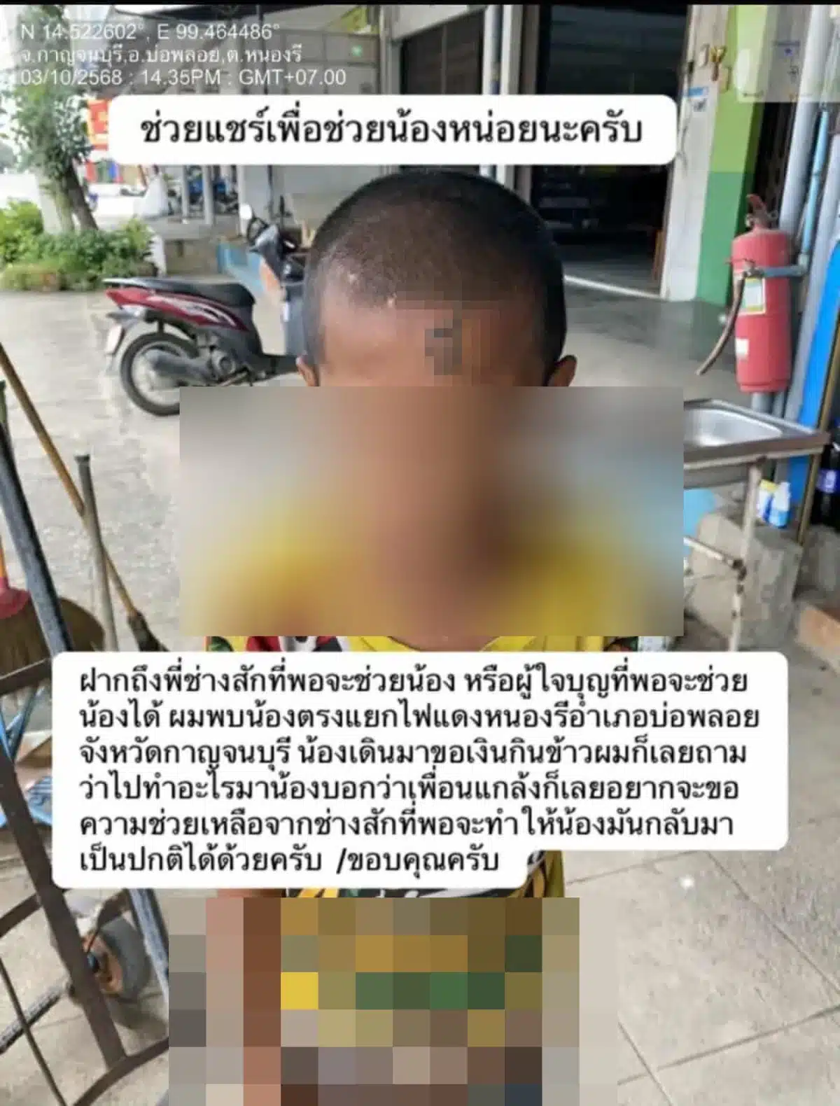 “เมื่อคืนผมขึ้นไลฟ์แล้วมีคนเข้ามาขอให้ผมไปช่วยเหลือน้องคนนี้ที ใครที่อยู่แถวหนองรี บ่อพลอย กาญจนบุรี เจอเด็กคนนี้ทักหาผมทีนะครับ“