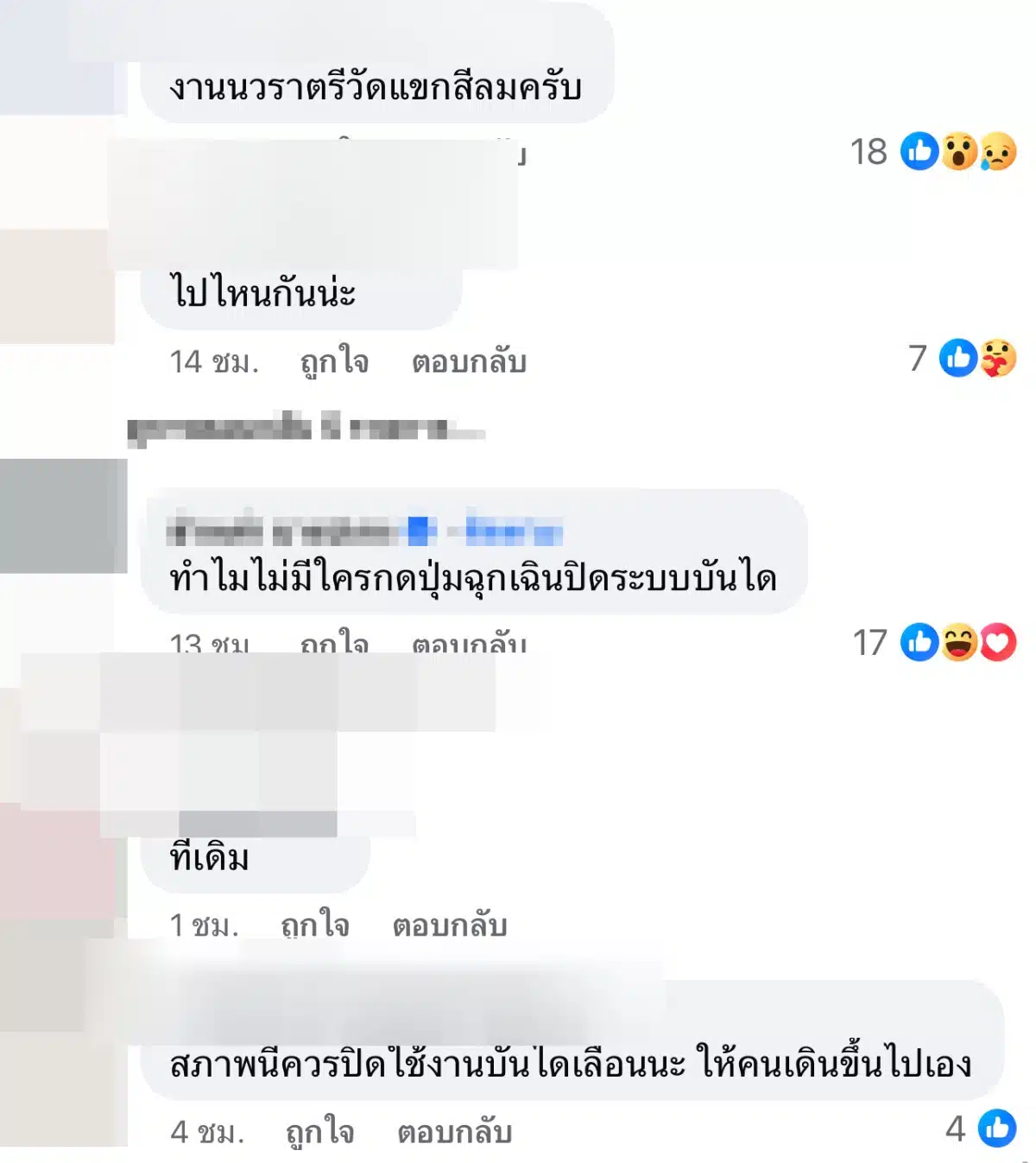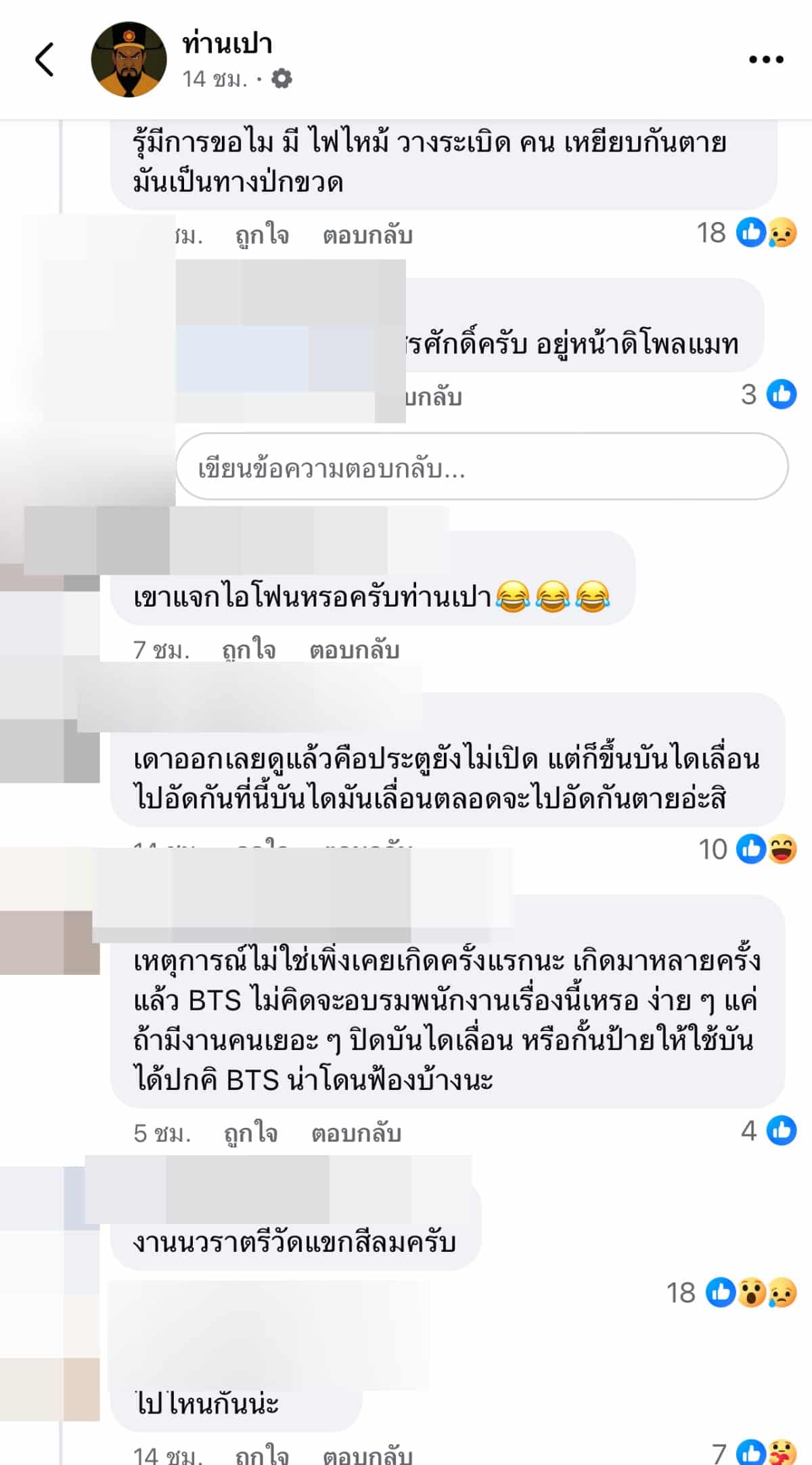 ”เหตุการณ์ไม่ใช่เพิ่งเคยเกิดครั้งแรกนะ เกิดมาหลายครั้งแล้ว BTS ไม่คิดจะอบรมพนักงานเรื่องนี้เหรอ ง่าย ๆ แค่ถ้ามีงานคนเยอะ ๆ ปิดบันไดเลื่อน หรือกั้นป้ายให้ใช้บันได้ปกคิ BTS น่าโดนฟ้องบ้างนะ“