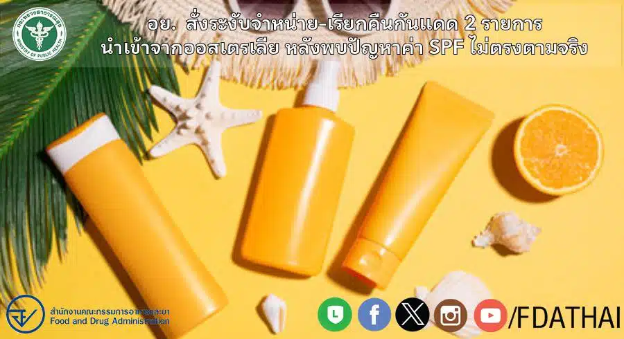 สำนักงานคณะกรรมการอาหารและยา (อย.) ออกโรงแจงกรณี “ออสเตรเลีย” เรียกคืนผลิตภัณฑ์กันแดด 21 รายการ หลังพบค่า SPF ไม่ตรงตามที่โฆษณา โดยพบ 2 รายการมีจดแจ้งในไทย ขณะนี้ประสานผู้นำเข้าระงับการจำหน่ายและเรียกคืนผลิตภัณฑ์จนกว่าผลการตรวจวิเคราะห์ยืนยันค่า SPF ในผลิตภัณฑ์ถูกต้อง เผยมีมาตรการเฝ้าระวังคุณภาพและดำเนินคดีกับผลิตภัณฑ์ที่ค่า SPF ไม่ตรงตามจริงอย่างเข้มข้น ขอให้ประชาชนวางใจ