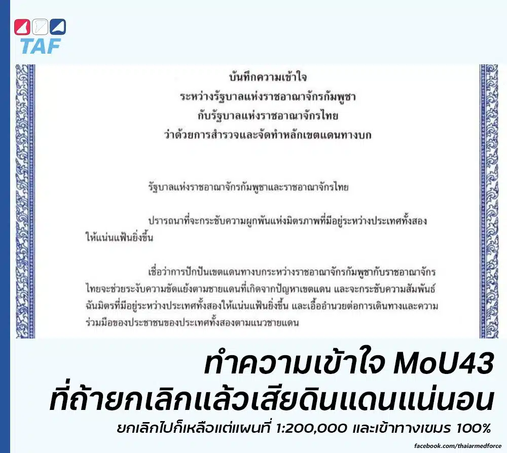 วันนี้ (5 ต.ค.) แอคเคาต์ @ThaiArmedForce สื่ออิสระและชุมชนออนไลน์ด้านเทคโนโลยีทางการทหารของประเทศไทย เปิดเผยเนื้อหาซึ่งอ้างว่าเป็น การทำความเข้าใจประเด็น #MoU43 สั้น ๆ ง่าย ๆ แล้วจะเข้าใจว่า ทำไม “TAF” จึงบอกว่า ถ้ายกเลิก MoU43 นอกจากจะเข้าทางเขมร 100% แล้ว ยังรับประกันการเสียดินแดนแน่นอน