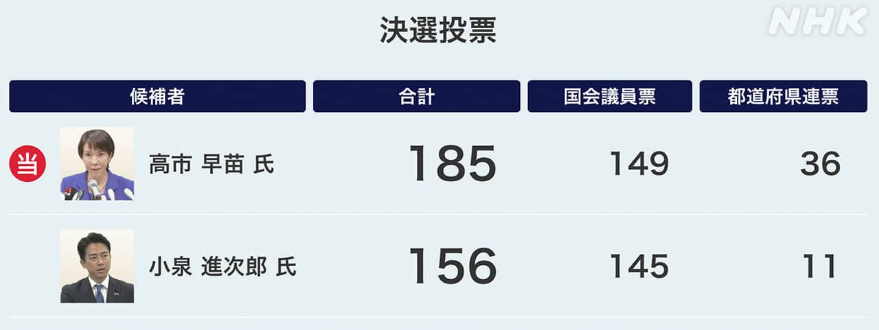 โดยผลการลงคะแนนรอบตัดสินเป็น ทาคาอิจิ ซานาเอะ ที่ได้ไป 185 คะแนน (ส.ส. 149 + จังหวัด 36) เอาชนะ โคอิซูมิ ชินจิโร่ ที่ได้ไป 156 คะแนน (ส.ส. 145 + จังหวัด 11) และนับเป็นครั้งแรกที่มีผู้หญิงได้รับเลือกให้เป็นหัวหน้าพรรค LDP นับตั้งแต่ก่อนตั้งพรรคเมื่อปี 1955