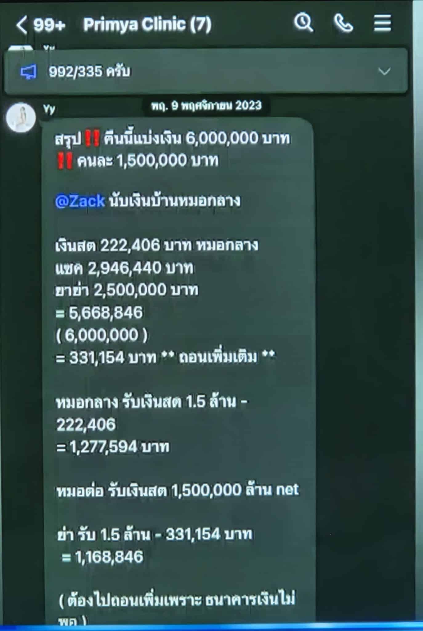 พ.ย. 2023 ยังปรากฏเอกสาร แชต Line ที่มีการแบ่งเงินปันผลกัน 6 ล้านบาท ที่เมย์เอามาเปิดโชว์ในโหนกระแสและทนายพยายามจะเกี่ยวโยงไปว่าเป็นแชทปลอมหรือไม่ (รูปในคอมเมนต์ที่ 2)