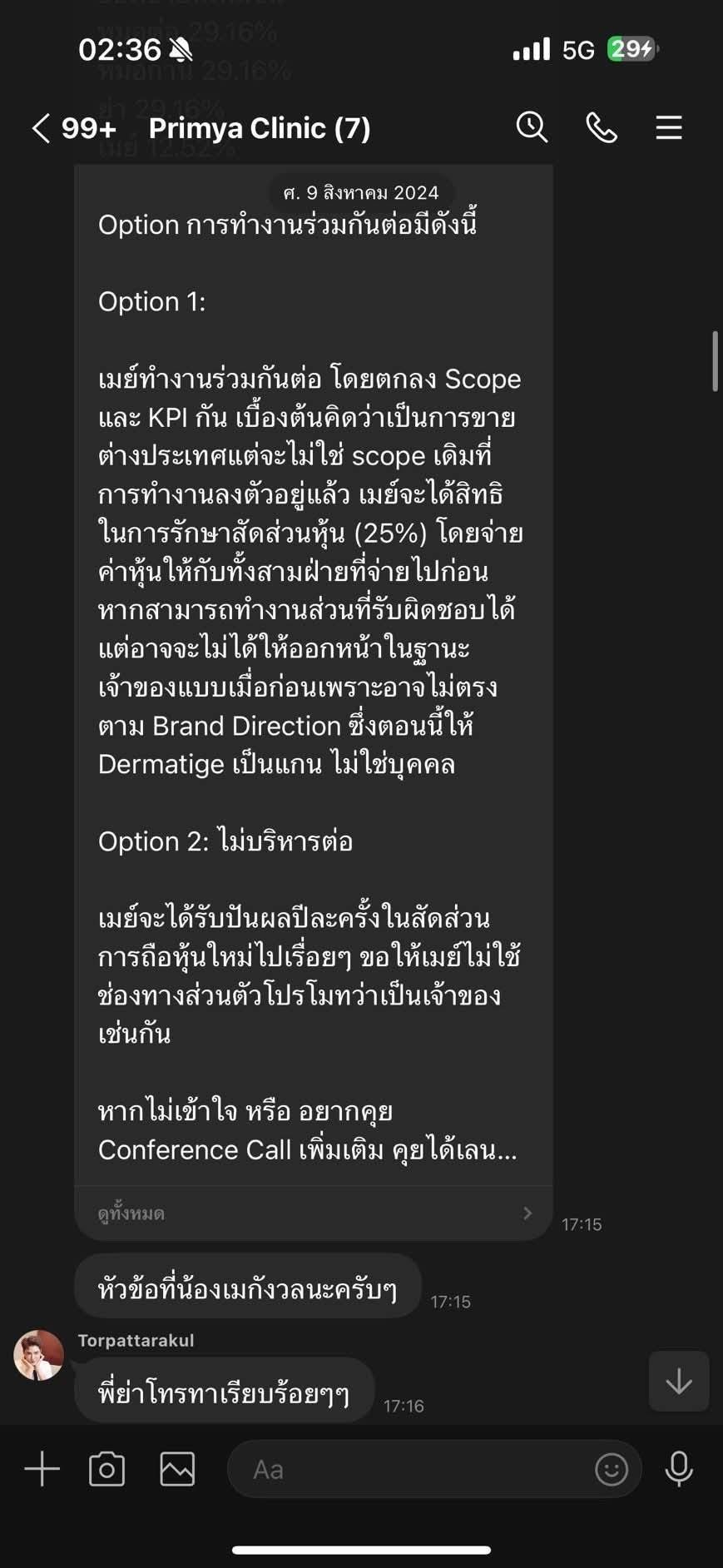 จากนั้น หมอของขวัญ ได้โพสต์รูปภาพแชตกลุ่มไลน์ของ Primya Clinic ซึ่งมีทั้งสมาชิกทั้ง 7 คน โดยมีทั้งคุณญาญ่า หมอต่อ หมอกลาง เม และแซคอยู่ในนั้นด้วย โดยเป็นการสนทนาเกี่ยวกับผู้ถือหุ้น ด้านหมอของขวัญระบุแคปชั่นว่า “ประเด็นแรก ฝากหุ้นหรือขายขาด หลักฐาน – ถ้าขายขาดจะมีแชตนี้ขึ้นมาได้ยังไง เหตุผล – ถ้าชั้นเป็นเมนะ ง่าย ๆ เลย ถ้าบริษัทอาหารเสริมชั้นมีปัญหา รายได้ขาดแล้ว ชั้นจะเอาหุ้นคลินิกไปขายในราคา 3แสนบาททั้ง ๆ ที่เปิดวันแรกก็ได้เป็นล้านแล้วมั้ย หรือจะกอดหุ้นไว้แน่น ๆ ถ้าเป็นคุณ คุณจะ…”