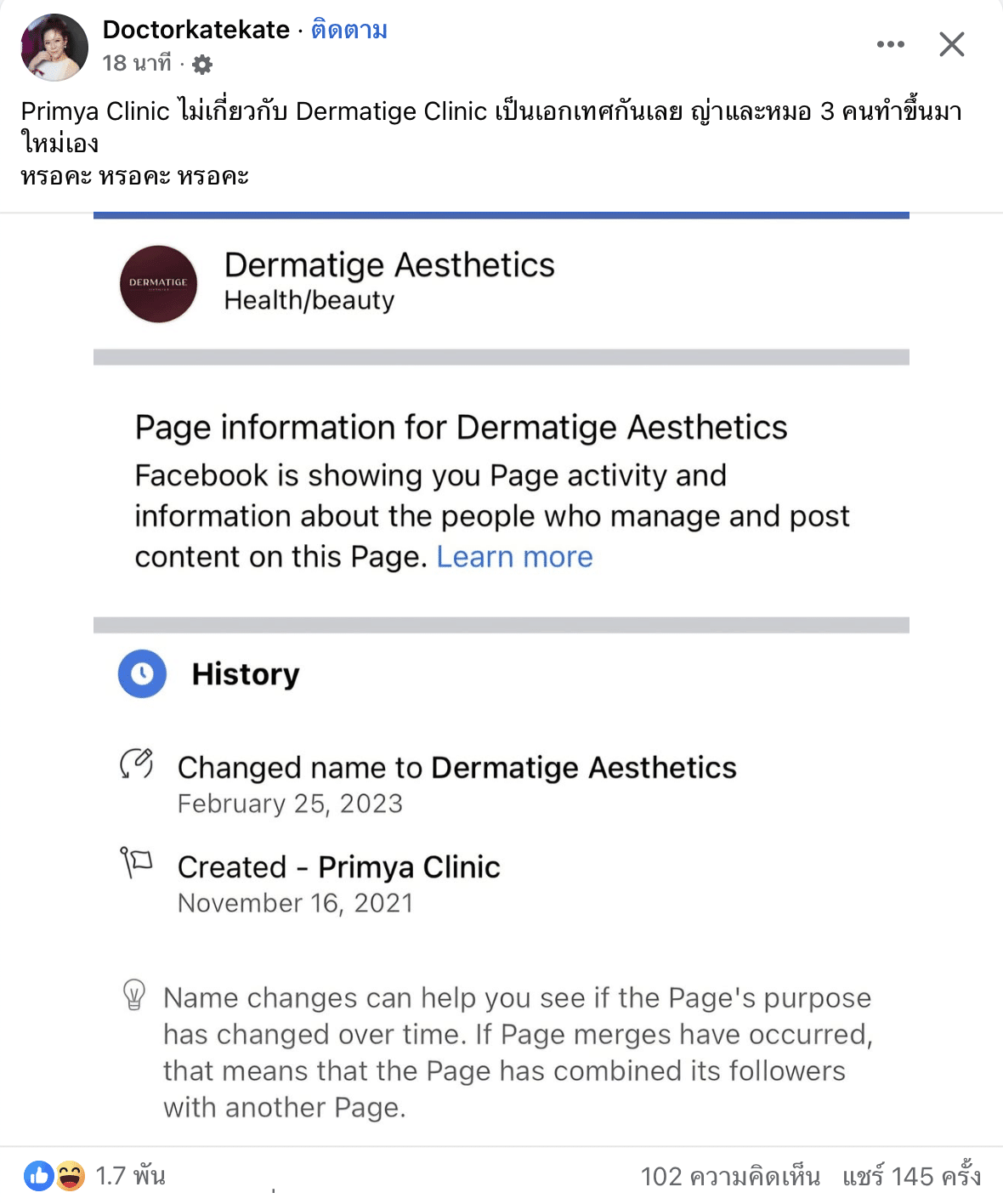 ก.พ. 2023 Facebook Primya Clinic เปลี่ยนชื่อเป็น Dermatige Clinic รวมถึงช่องทางโซเชียล และไลน์ลูกค้าทั้งหมดของ Primya Clinic (รูปในคอมเมนต์ที่ 1)