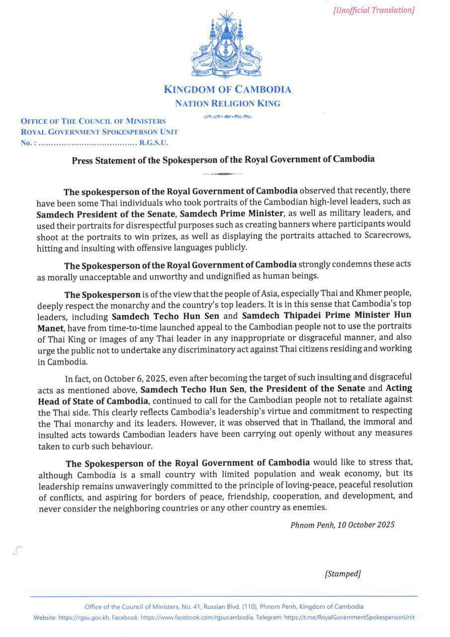 ล่าสุดสมเด็จ ฮุน เซน ได้โพสต์ข้อความเฟซบุ๊กเผยแพร่แถลงการณ์โฆษกรัฐบาลกัมพูชา ถึงประเด็นดังกล่าวว่า “เมื่อไม่นานมานี้ มีบุคคลชาวไทยบางรายได้นำภาพถ่ายของผู้นำระดับสูงของกัมพูชา เช่น สมเด็จประธานวุฒิสภา สมเด็จนายกรัฐมนตรี รวมถึงผู้นำกองทัพ ไปใช้ในทางไม่ให้เกียรติ เช่น ทำเป็นป้ายให้ผู้เข้าร่วมกิจกรรมยิงเป้าใส่ภาพเพื่อชิงรางวัล หรือเอาภาพไปติดกับหุ่นไล่กา แล้วทำการตีหรือด่าทอด้วยถ้อยคำหยาบคายต่อสาธารณะ