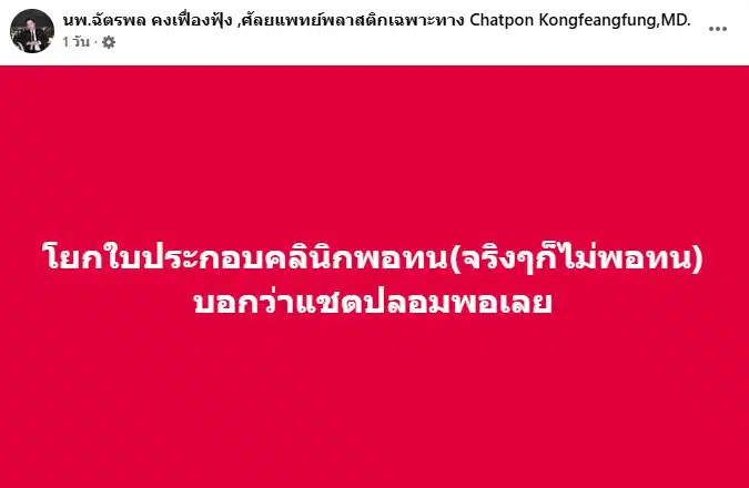ต่อมา นพ.ฉัตรพล ได้โพสต์ว่า “โยกใบประกอบคลินิกพอทน (จริง ๆ ก็ไม่พอทน) บอกว่าแชตปลอมพอเลย” พร้อมกับคอมเมนต์ใต้โพสต์ว่า “อินเพราะอะไร เพราะเคยโดนโกงไง”