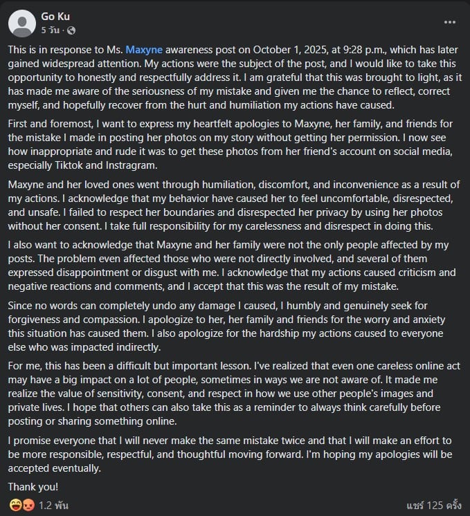 “นี่คือการตอบสนองต่อโพสต์เพื่อสร้างความตระหนักรู้ของคุณ Maxyne เมื่อวันที่ 1 ตุลาคม 2025 เวลา 21:28 น. ซึ่งโพสต์ดังกล่าวได้รับความสนใจในวงกว้างในเวลาต่อมา การกระทำของผมเป็นประเด็นหลักของโพสต์นั้น และผมขอใช้โอกาสนี้ชี้แจงด้วยความสัตย์จริงและด้วยความเคารพ”