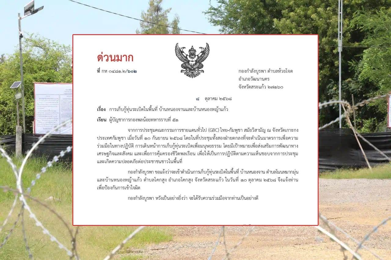 กองกำลังบูรพา ออกเอกสารด่วน ไทย-กัมพูชา ร่วมกู้ทุ่นระเบิด ที่บ้านหนองจานและบ้านหนองหญ้าแก้ว ในวันที่ 10 ต.ค. 68