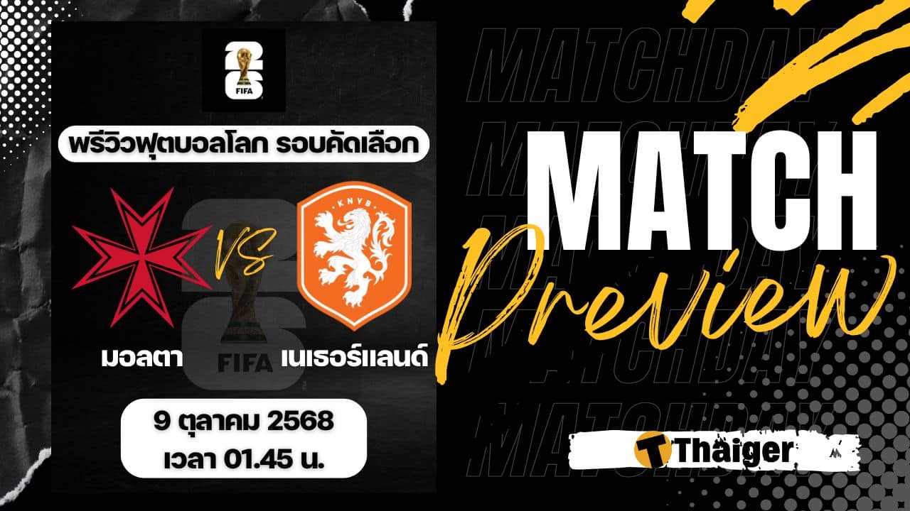 9 ตุลาคม 2568 เวลา 01.45 น. ถ่ายทอดสด ดูบอลสด ฟุตบอลโลก 2026 รอบคัดเลือก โซนยุโรป มอลตา พบ เนเธอร์แลนด์ The Thaiger พาไปวิเคราะห์เกม พร้อมการทำนายผล และคาดการณ์ 11 ตัวจริงได้ที่นี่