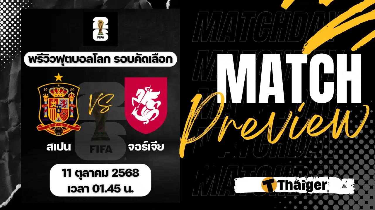 11 ตุลาคม 2568 เวลา 01.45 น. ถ่ายทอดสด ดูบอลสด ฟุตบอลโลก 2026 รอบคัดเลือก โซนยุโรป คู่ระหว่าง สเปน พบ จอร์เจีย The Thaiger พาไปวิเคราะห์เกม พร้อมการทำนายผล และคาดการณ์ 11 ตัวจริงได้ที่นี่
