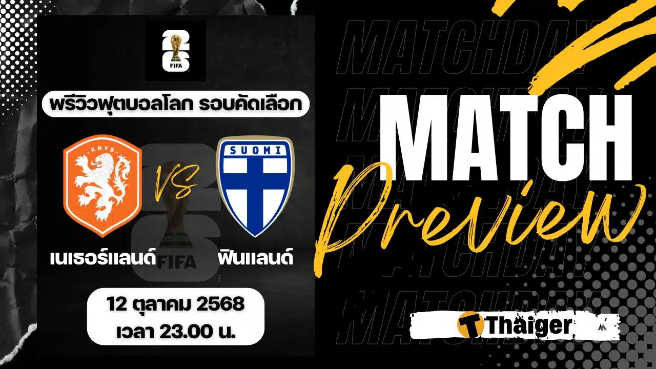 12 ตุลาคม 2568 เวลา 23.00 น. ถ่ายทอดสด ดูบอลสด ฟุตบอลโลก 2026 รอบคัดเลือก โซนยุโรป คู่ระหว่าง เนเธอร์แลนด์ พบ ฟินแลนด์ The Thaiger พาไปวิเคราะห์เกม พร้อมการทำนายผล และคาดการณ์ 11 ตัวจริงได้ที่นี่
