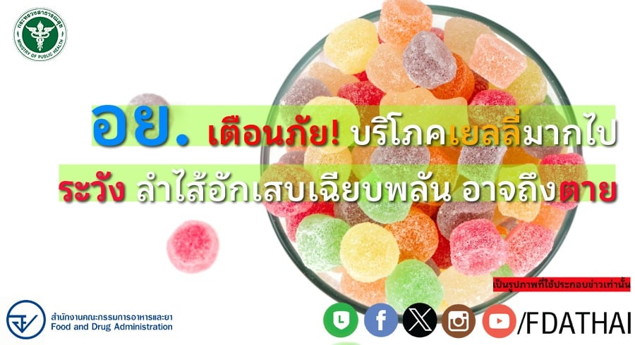 สำนักงานคณะกรรมการอาหารและยา (อย.) ออกประกาศเตือนผู้บริโภคให้ระมัดระวังอันตรายจากการบริโภค “เยลลี่” และขนมที่มีน้ำตาลกับเจลาตินสูงในปริมาณมากเกินไป หลังจากมีกรณีศึกษาจากต่างประเทศที่ชายวัย 33 ปี ต้องเข้าโรงพยาบาลด้วยภาวะลำไส้อักเสบเฉียบพลัน หลังกินเยลลี่รสโคล่าไปถึง 3 กิโลกรัม ภายในเวลาเพียง 3 วัน