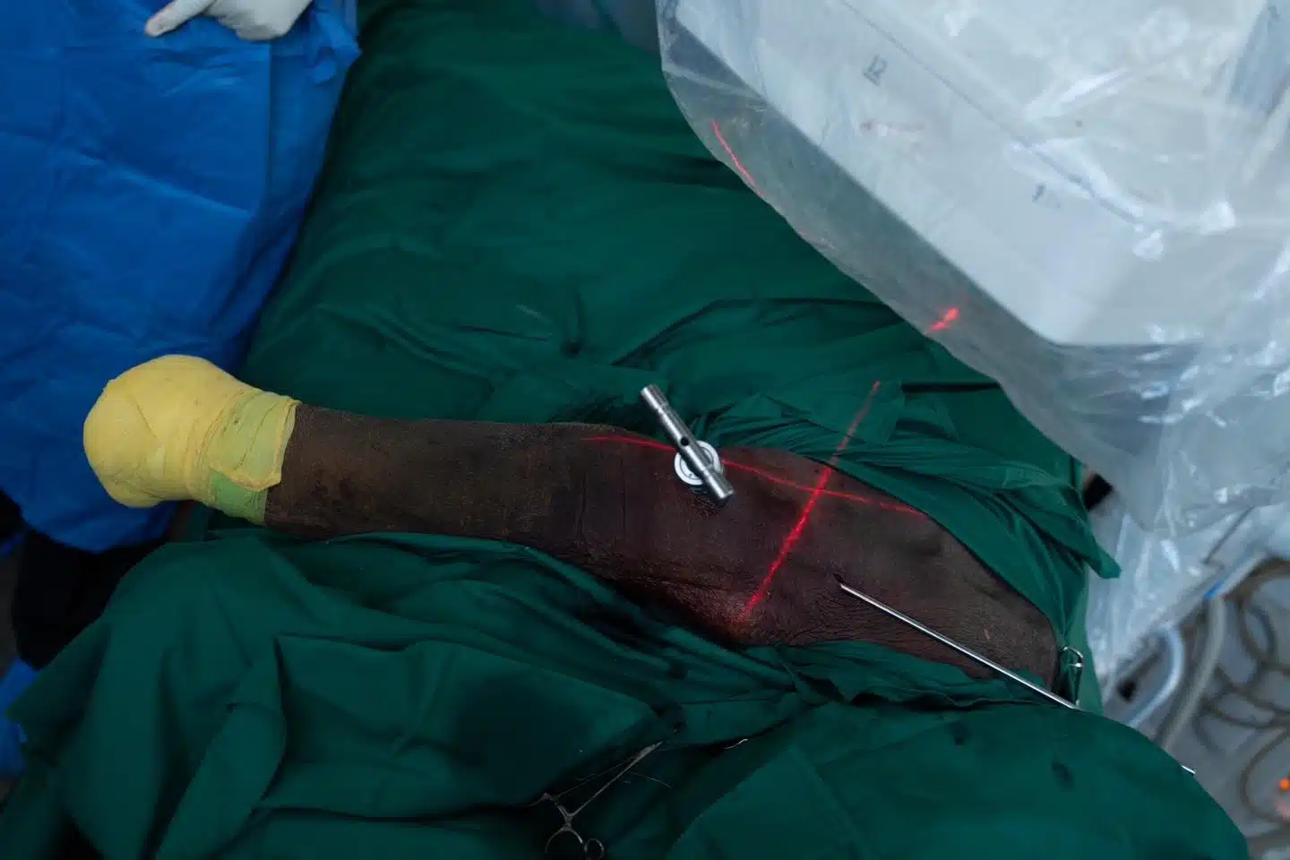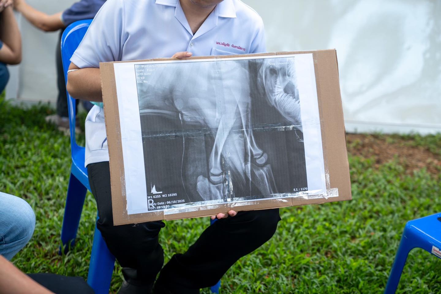 โดยทีมสัตวแพทย์และผู้เชี่ยวชาญได้ร่วมกันผ่าตัด เพื่อแก้ไขภาวะกระดูกขาหน้าท่อนบนหัก มีการใส่เครื่องยึดตรึงกระดูกภายนอก
